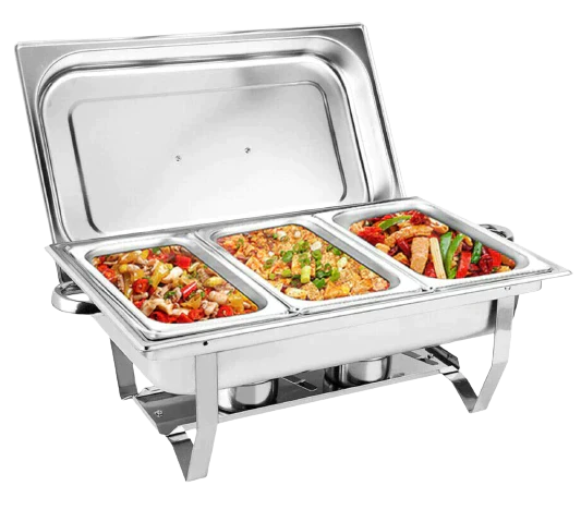 Deine warmen Gerichte werden in Chafing Dishes serviert. Das sind Wärmebehälter, die mit je zwei speziellen Brennern beheizt werden. Zudem ist auch das für das Gericht benötigte Vorlegebesteck enthalten.