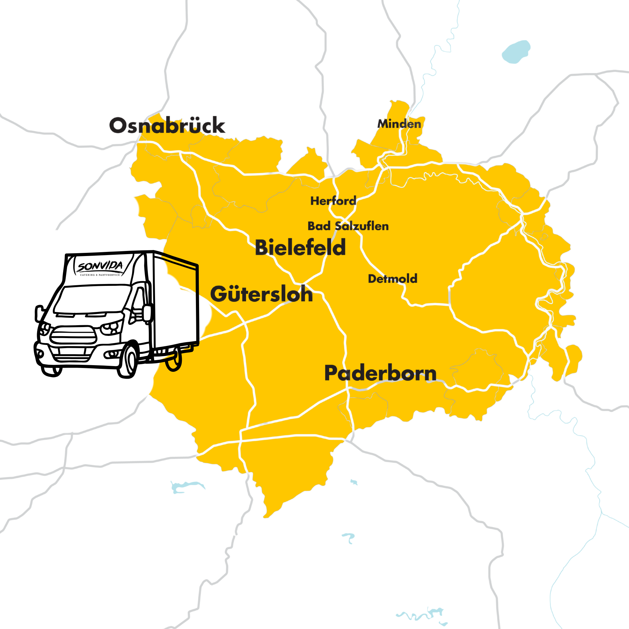 Bielefeld, Paderborn, Gütersloh, Minden, Detmold, Herford, Osnabrück, Bad Salzuflen, Bad Oeynhausen, Rheda-Wiedenbrück, Bünde, Lemgo, Löhne, Porta Westfalica, Lage, Delbrück, Beckum, Oelde, Dülmen, Höxter, Warendorf, Harsewinkel. Weiter entfernte Lieferungen gerne auf Anfrage.