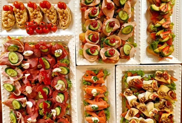 Unsere kalten Vorspeisen und Fingerfood servieren wir auf hochwertigen Servierplatten oder Schalen.